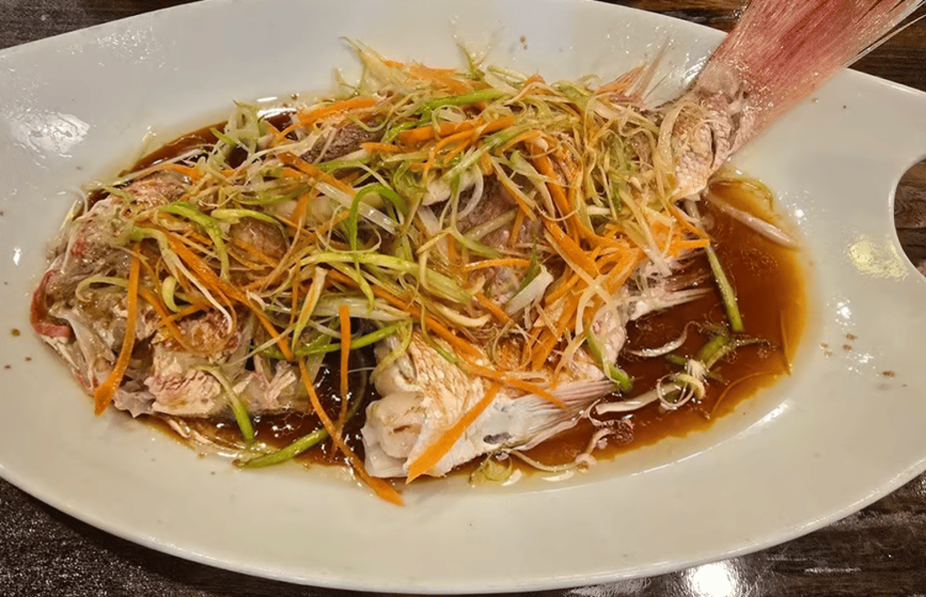 Steam Snapper with Chinese cooking wine, ginger, green onion and cooking hot oil drizzle on top.