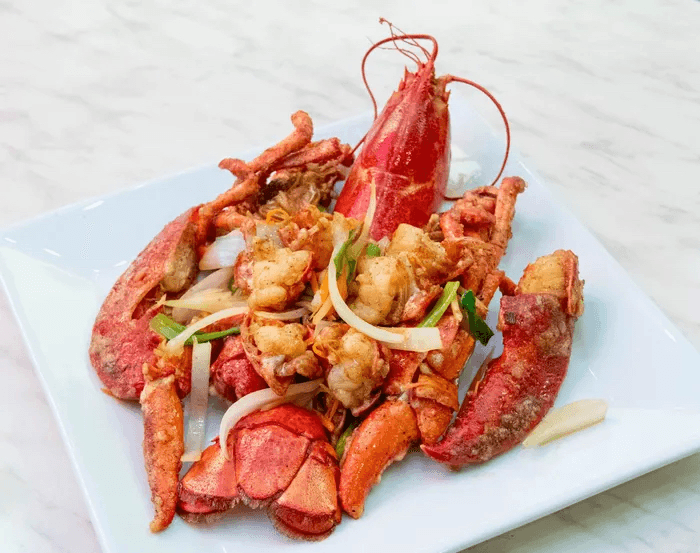Lobster steamed with Chinese cooking wine, ginger, green onion and cooking hot oil on top.