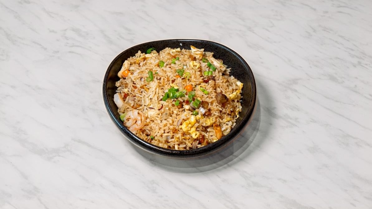 A savory blend of shrimp, chicken, pork, peas, carrots, and scrambled eggs, all stir-fried with seasoned rice and topped with fresh green onions.