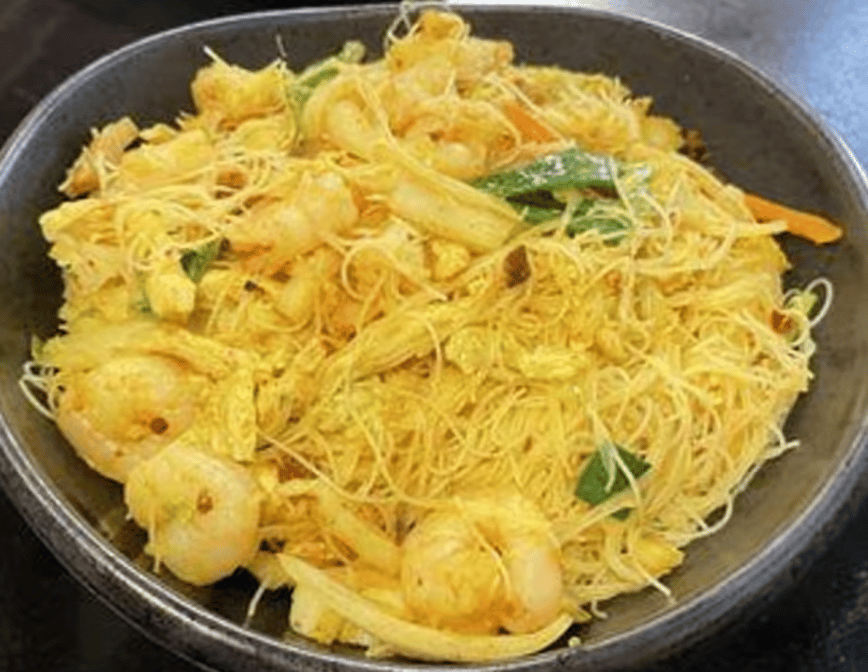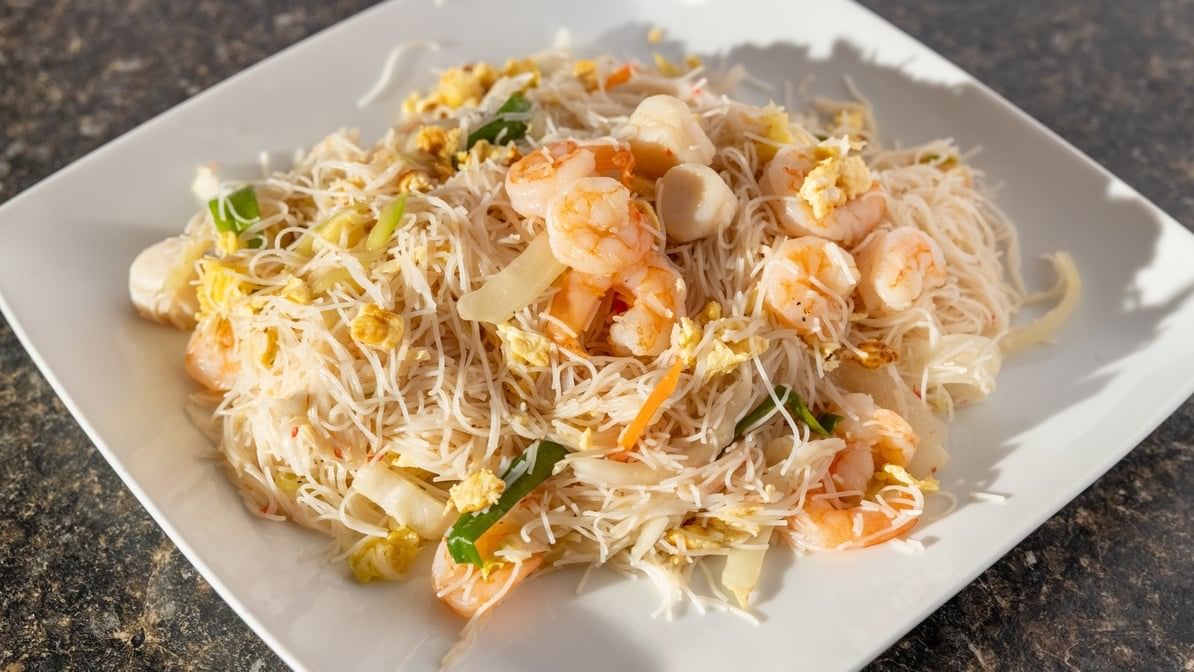 Rice vermicelli seasoned w. Curry powder, soy sauce and stir-fried w egg, shrimp, chicken, pork and mix vegetables.