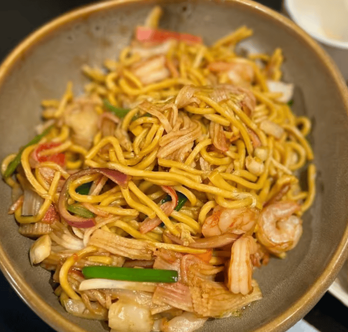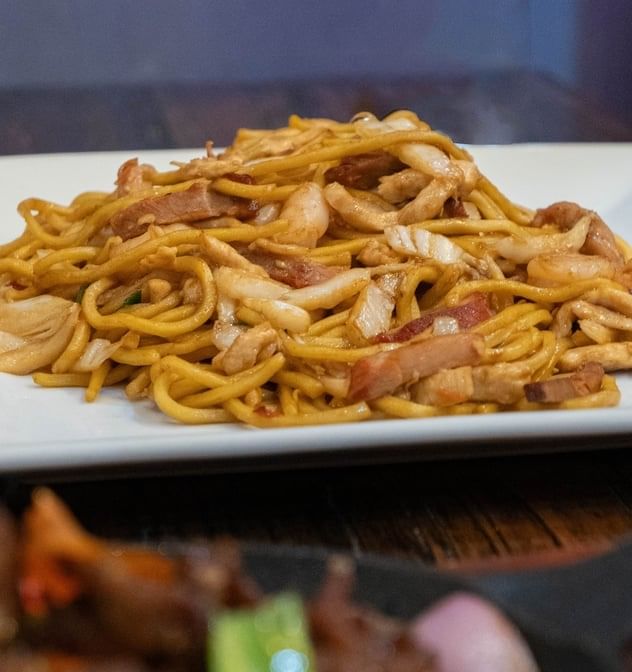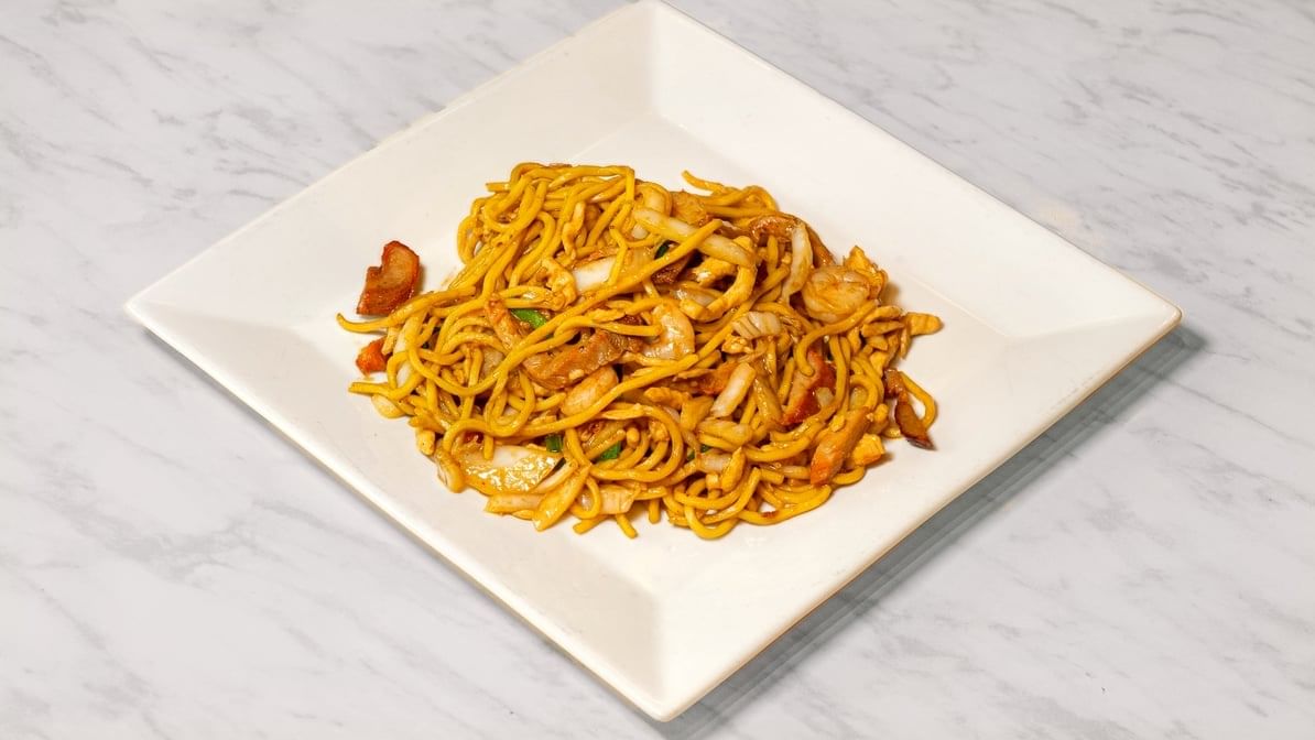 A savory mix of stir-fried noodles with shrimp, chicken, beef, and vegetables in a flavorful sauce.
