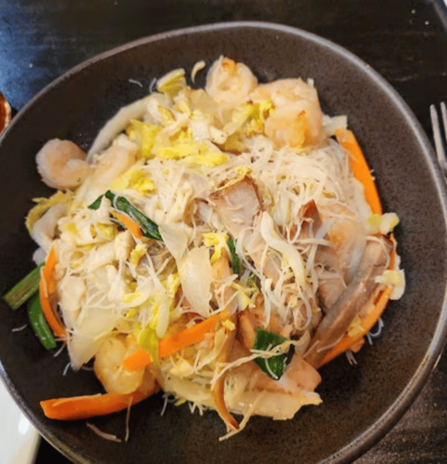 Thin rice noodles stir-fried with chicken, shrimp, pork, and a variety of vegetables, typically seasoned with soy sauce.