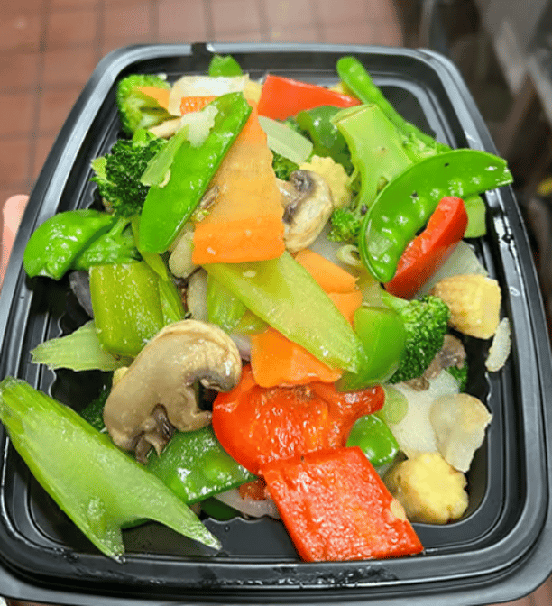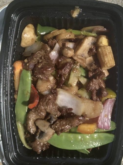 Mixed vegetable beef with choice of rice or lo mein (chicken, pork, shrimp, beef, or vegetable).