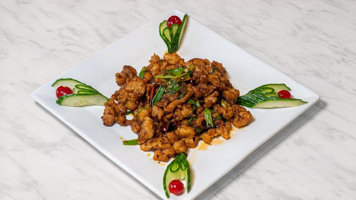 Medium. Marinated chicken stir-fried in a brown sauce. Seasoned with red chili peppers.