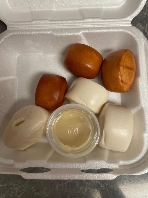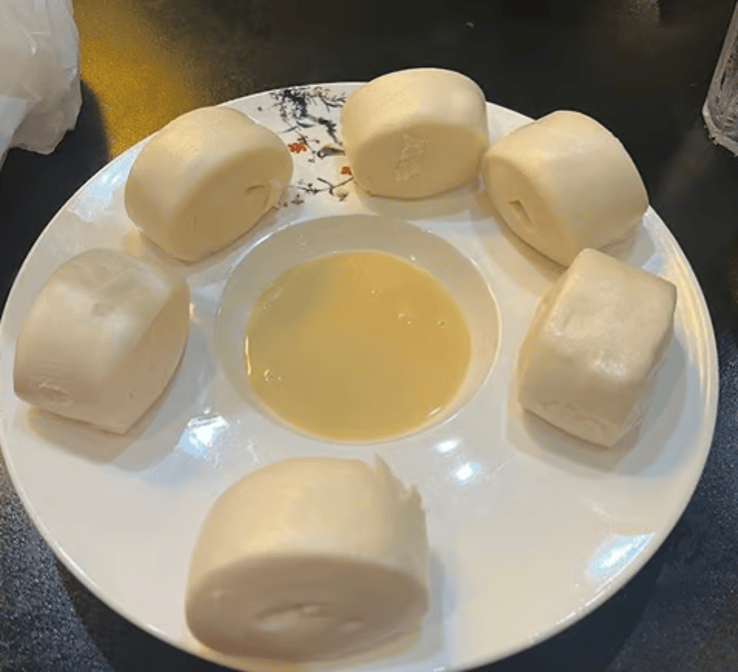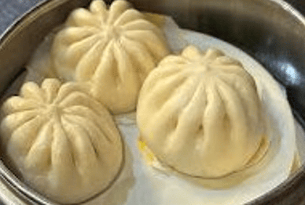 Handmade steamed buns, delicately filled with a sweet milk-infused center, offering a soft and pillowy texture.
