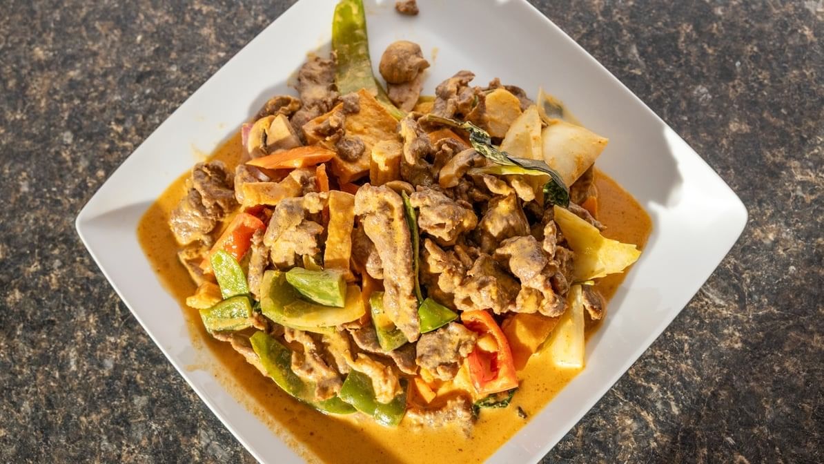Sliced beef with yellow curry, mushrooms, bamboo, onion, carrots, snap beans, tofu and bell peppers.