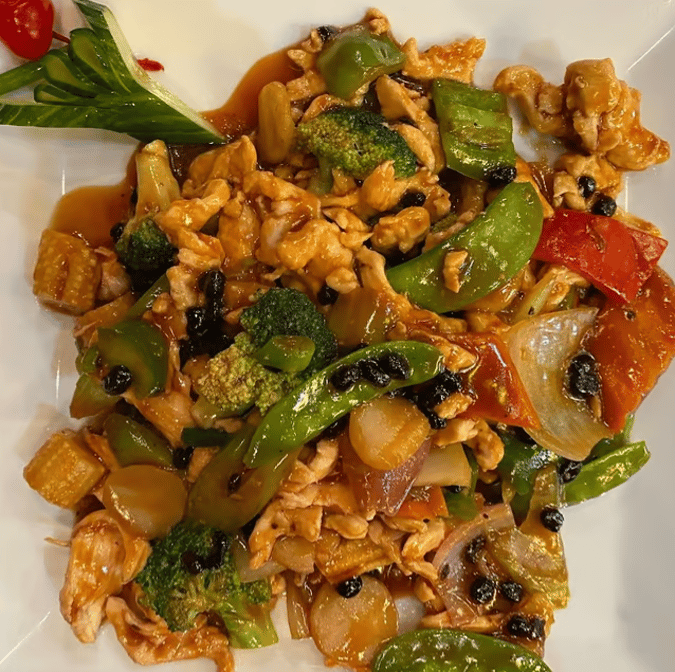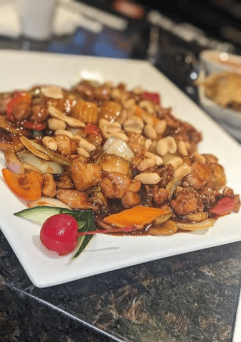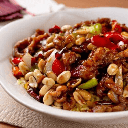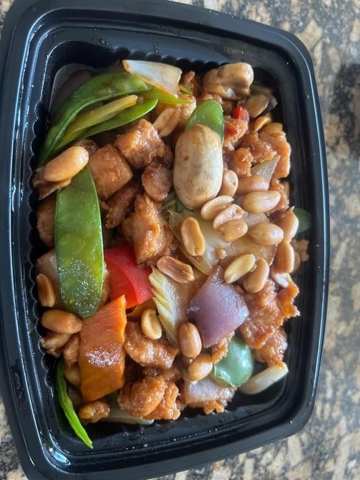 Beef sautéed with roasted peanuts, bell peppers, onions, bamboo shoots, water chestnuts, and carrots in a spicy brown sauce.