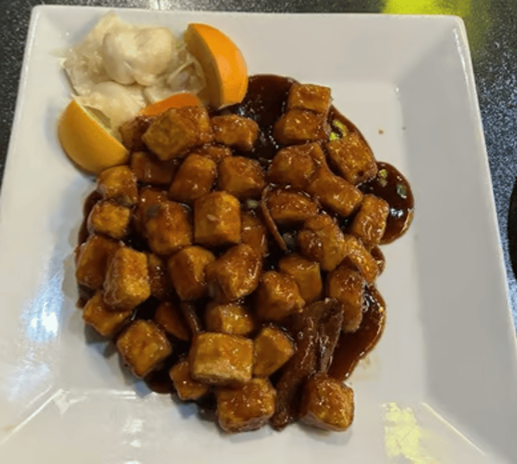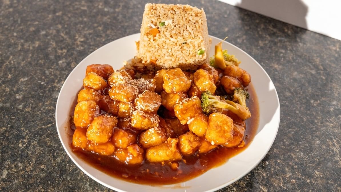 Tofu with a citrus twist. Served with choice of white rice, fried rice, or lo mein (various options available).