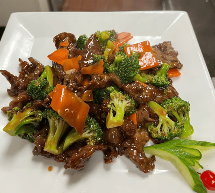 Tender beef and broccoli, options include various fried rices or lo mein with meat or vegetables.