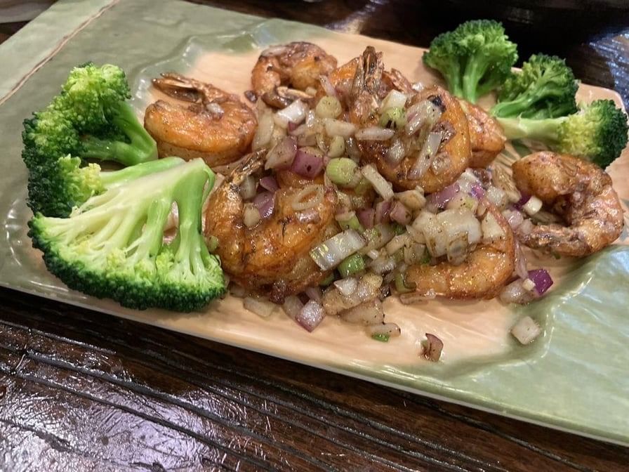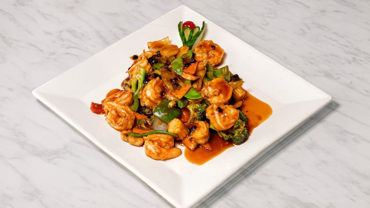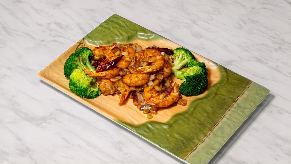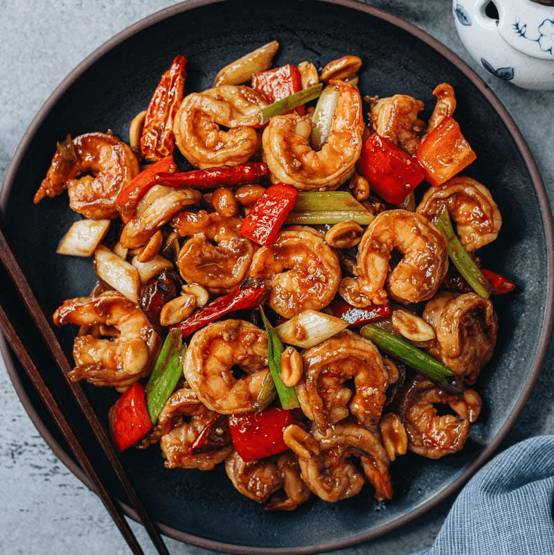 Succulent shrimp tossed in a spicy Kung Pao sauce with peanuts and vegetables.