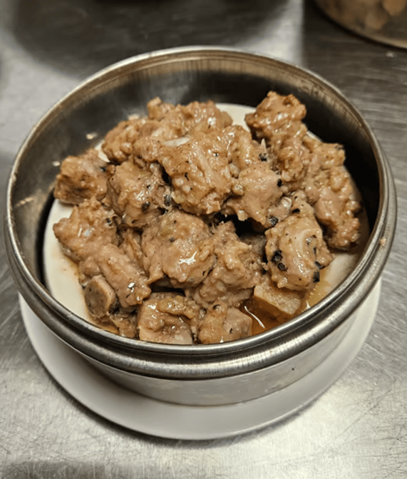 Spareribs marinated in black bean sauce, often accompanied by bell peppers and onions.