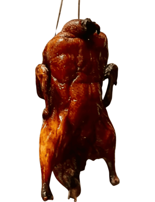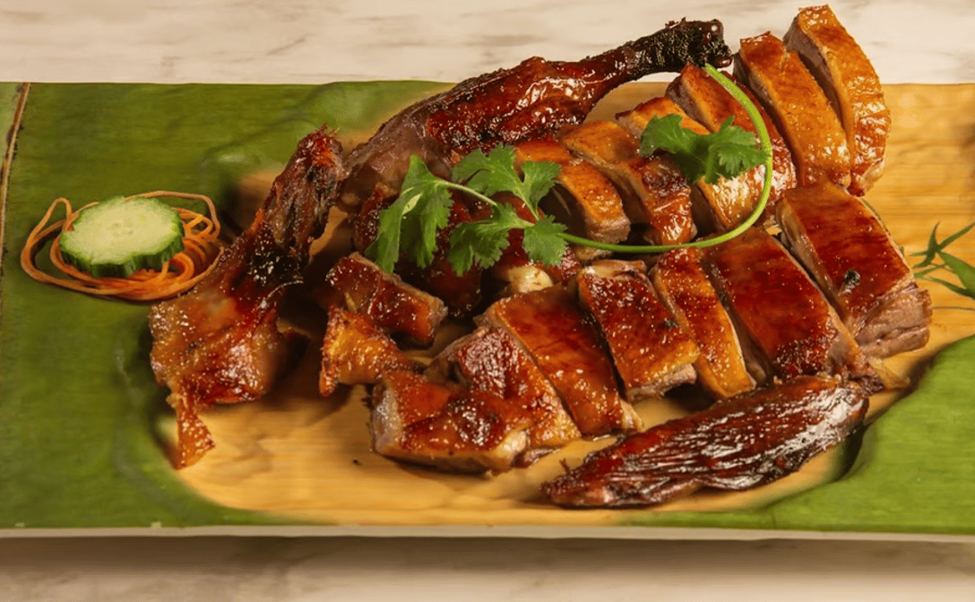 The duck is seasoned and roasted until the skin is crispy while the meat remains tender and juicy.