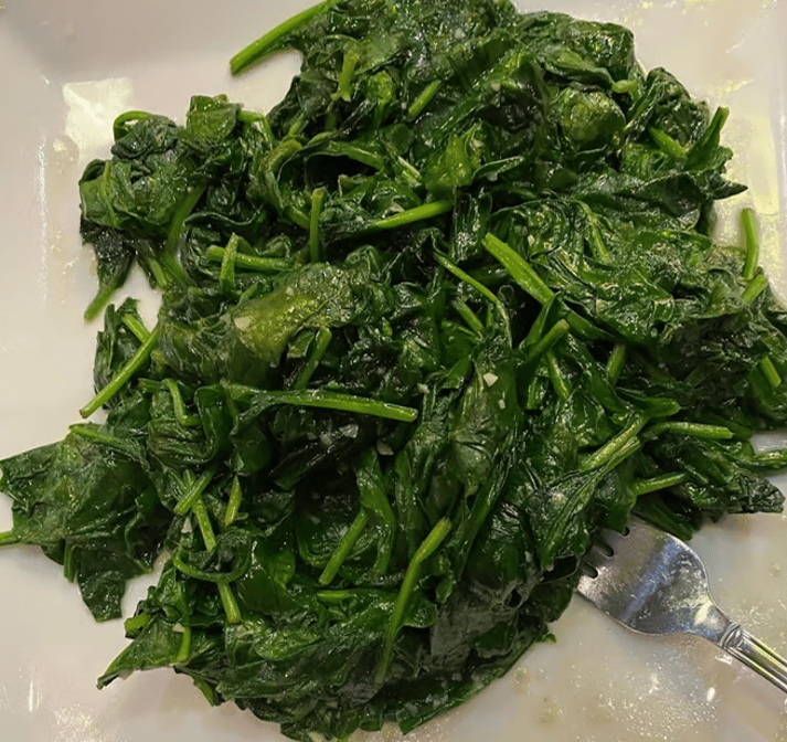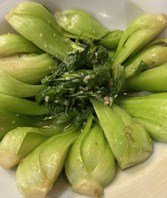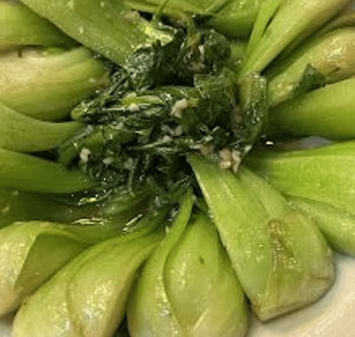 Bok choy, a Chinese leafy green. Choice of side: rice or lo mein, including house specials with chicken, pork, shrimp, and vegetarian options.