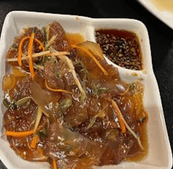 Thinly sliced jellyfish mixed with a light dressing, often including sesame oil and soy sauce, garnished with sesame seeds and possibly cucumber or cilantro.