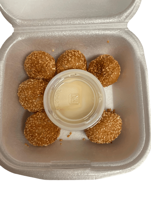 Deep-fried and coated in sesame seeds, this ball is filled with a sweet red bean paste.