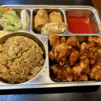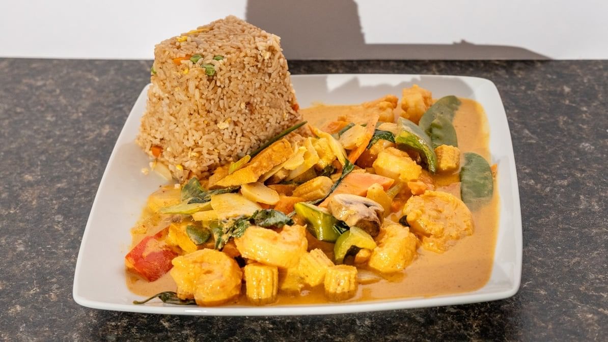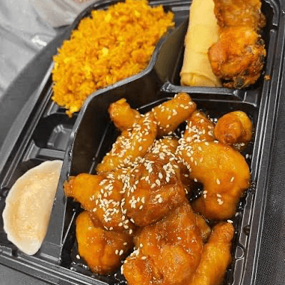 Shrimp enrobed in crispy coconut, served with choice of fried or white rice, special house fried rice or lo mein featuring chicken, pork, shrimp, or solely vegetable version.