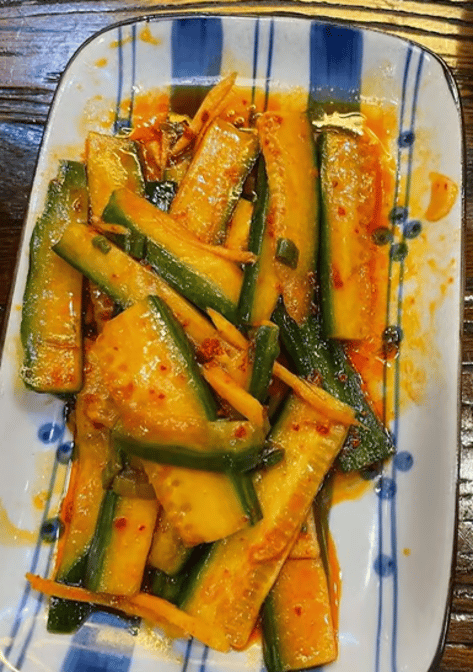 Traditional Hongkong-style smashed cucumber mixed with soy & vinegar with garlic, shallot and chili pepper. Drizzled with black sesame oil.