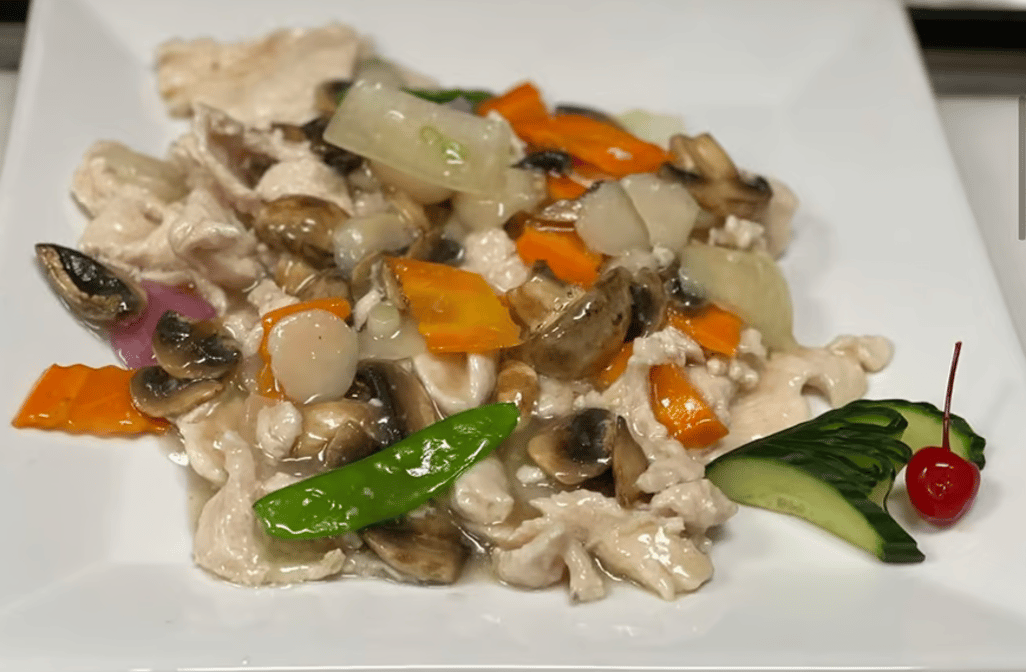 Chicken white meat stir-fry mushrooms, cabbage, carrots, sugar snap beans, Chinese white sauce.