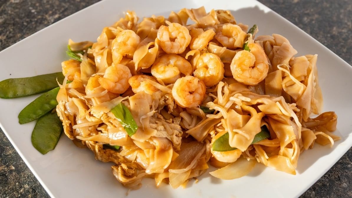 Stir-fried flat rice noodles with shrimp, bean sprouts, onions, and scallions in soy sauce.
