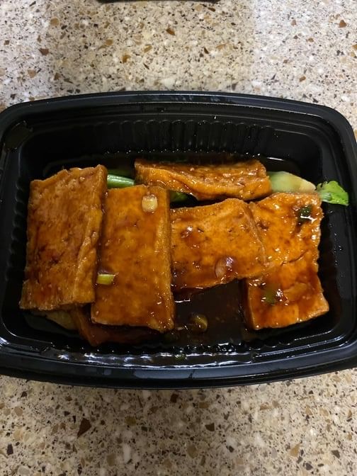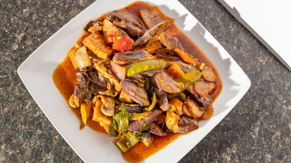 Fried tofu eggplant cooked with spicy sweet sauce.