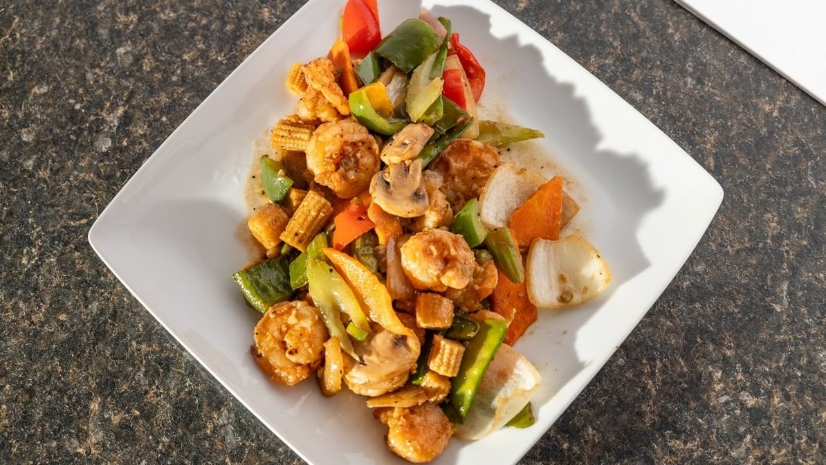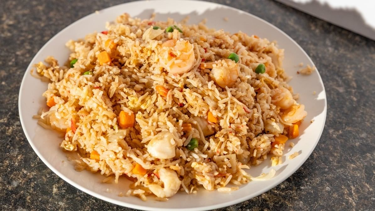 Succulent shrimp tossed with flavorful fried rice and fresh veggies.
