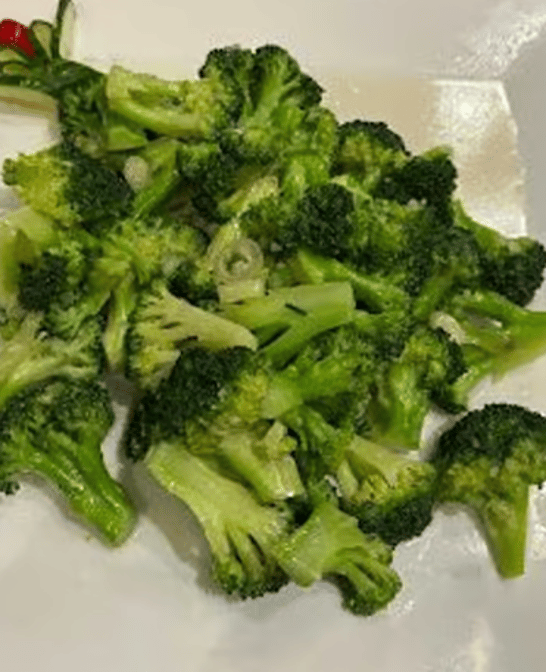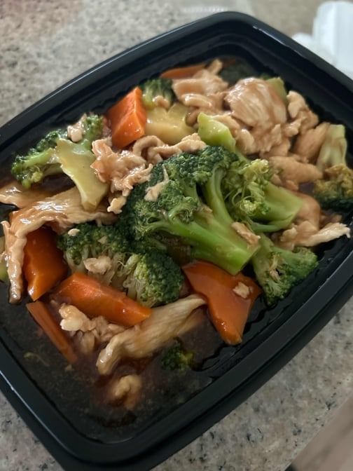 Stir Fried broccoli. Options: rice or lo mein varieties; includes chicken, pork, shrimp, beef, or vegetable sides