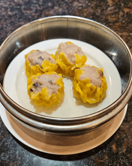 Steamed dumplings filled with a blend of pork and shrimp and scallop, often accompanied by shiitake mushrooms.