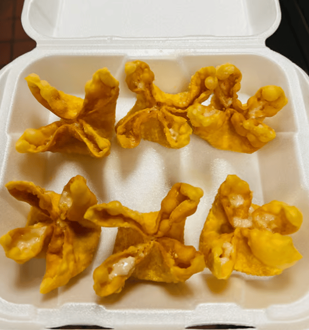Crispy wontons filled with creamy cheese, served with a side of sweet and sour dipping sauce.
