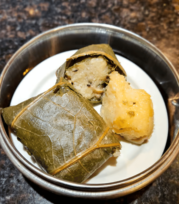 Sticky rice mixed with tender chicken pieces, typically wrapped and steamed in a lotus leaf, offering a subtle, aromatic flavor.
