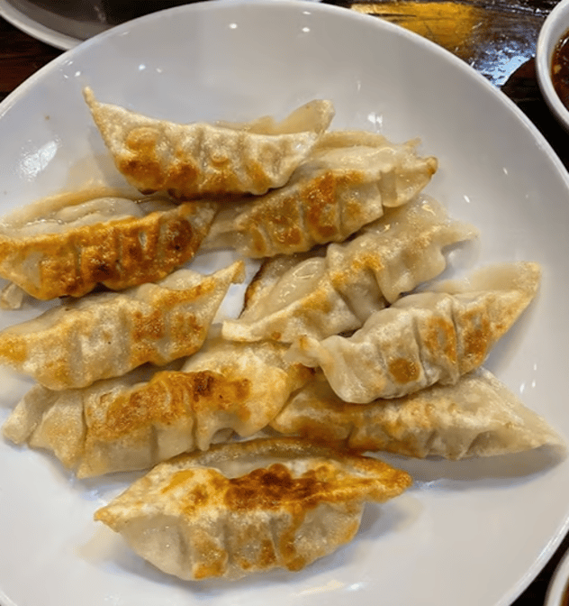 Pan-fried dumplings filled with seasoned pork and vegetables, served with a tangy soy-based dipping sauce.