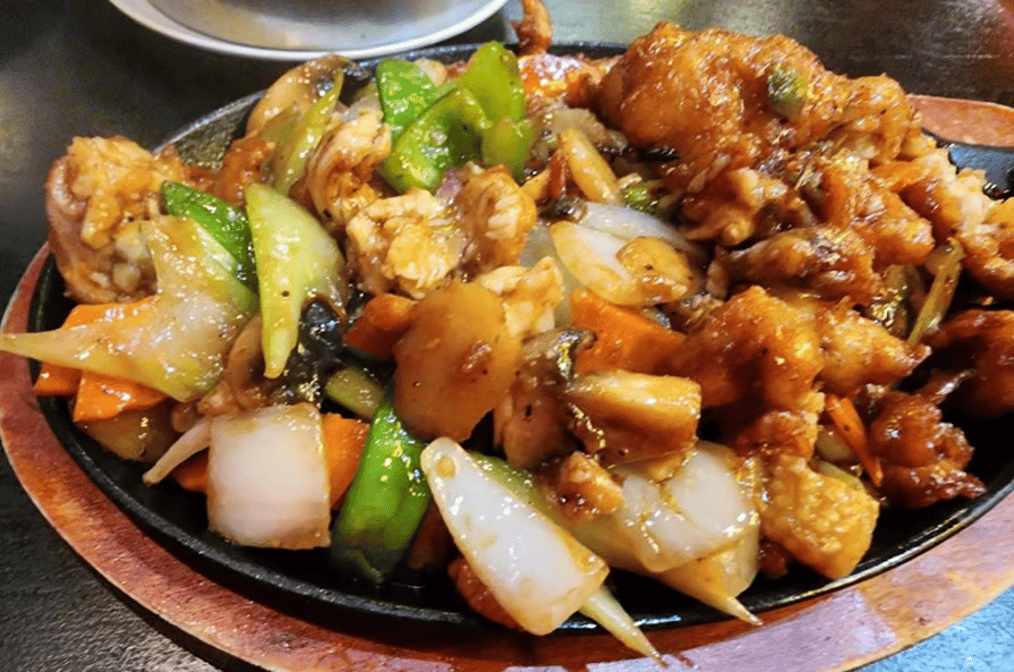 Tender lamb stir-fried with scallions and onions. Options for sides include various fried rices or lo mein, both with choices of chicken, pork, shrimp, beef, or vegetable.