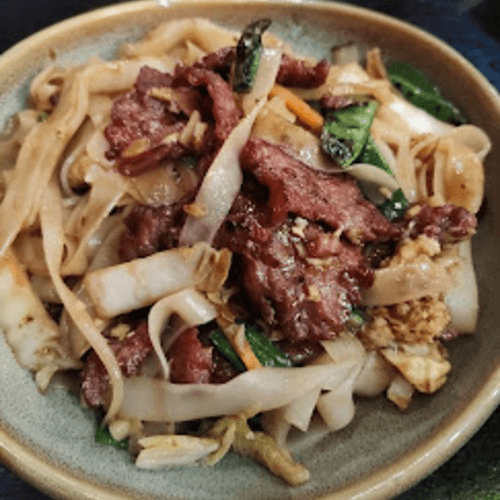 Thin rice noodles stir-fried with tender beef and vegetables.