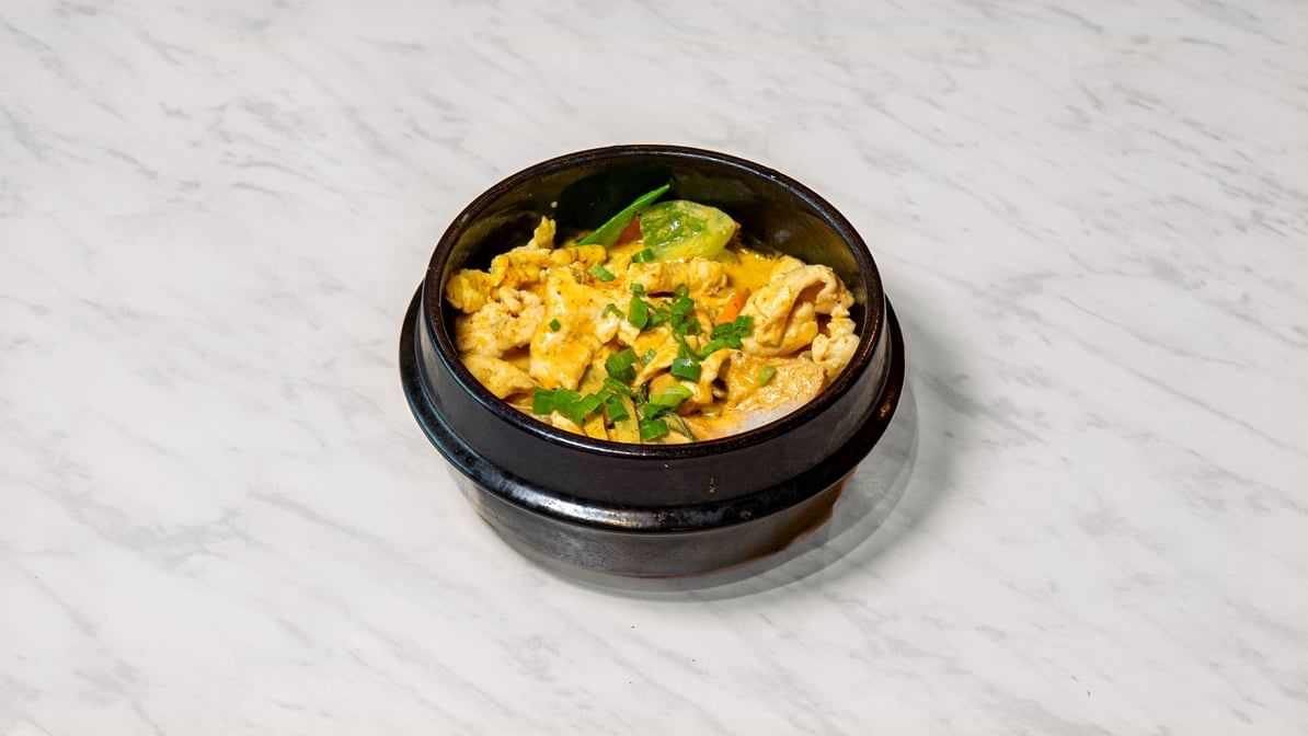 Scallop, shrimp, Crab meat, simmered with yellow curry in a clay pot.